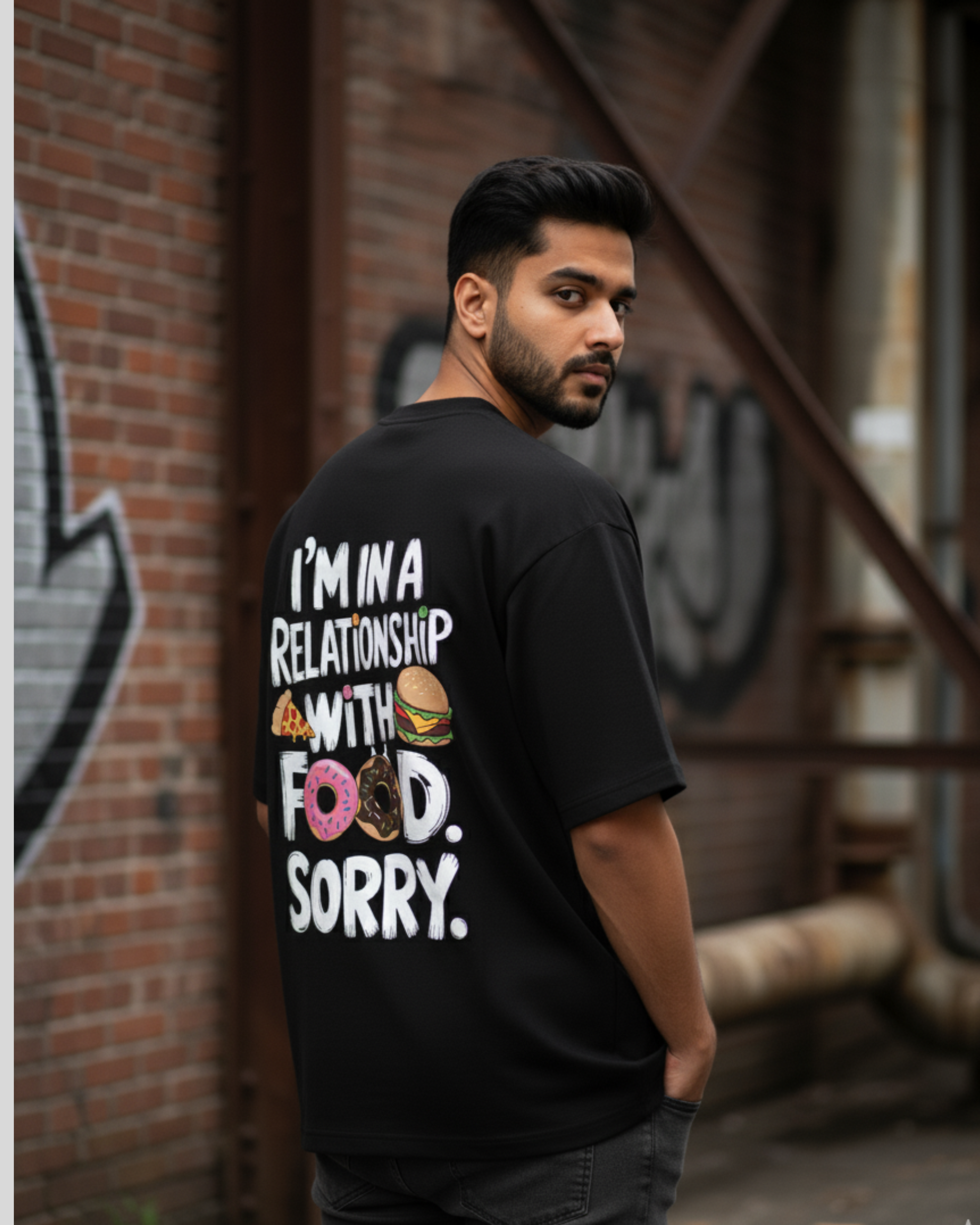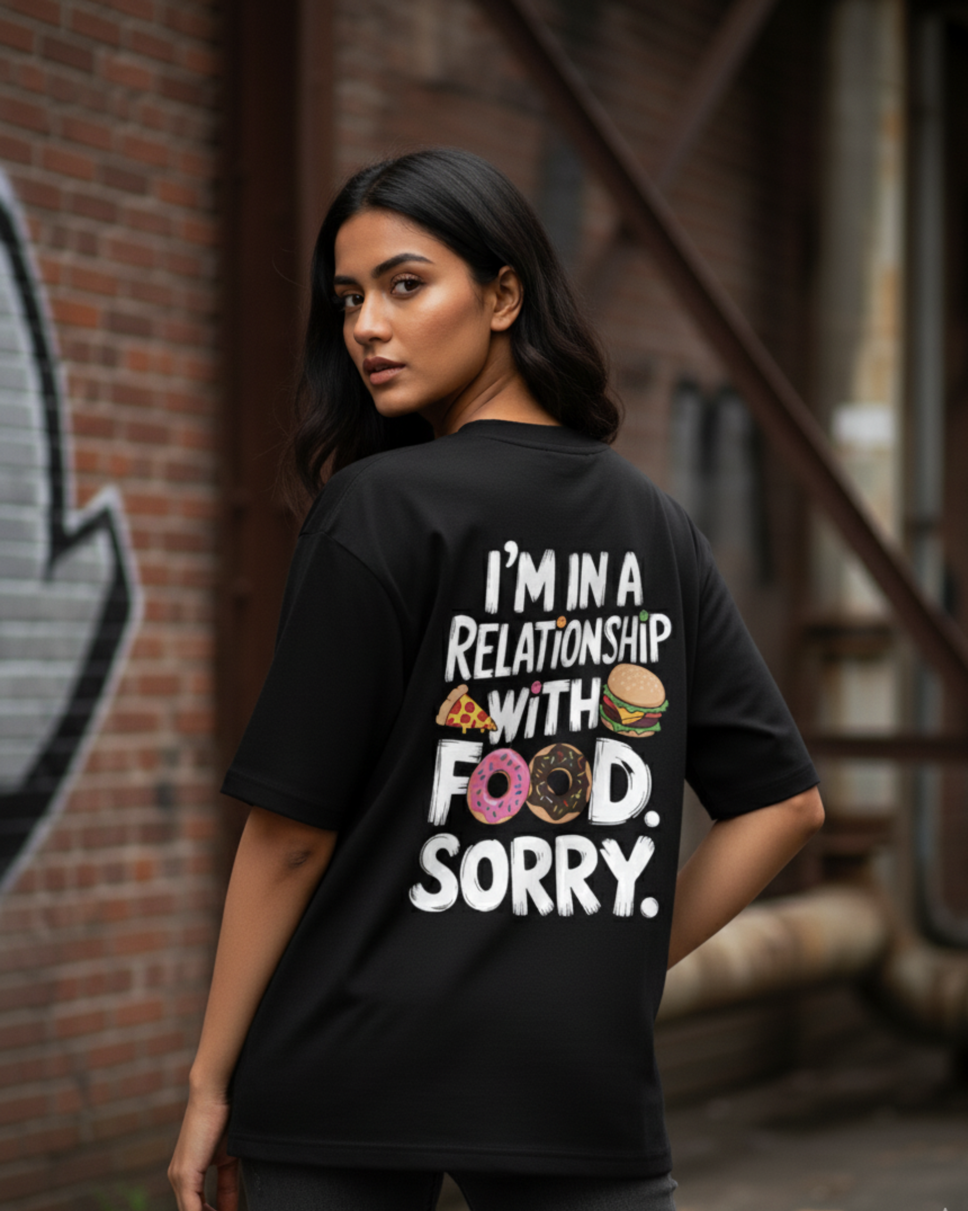 The back drops the truth bomb: “I’m in a relationship with FOOD. Sorry.” — surrounded by colorful icons of your favorite guilty pleasures.