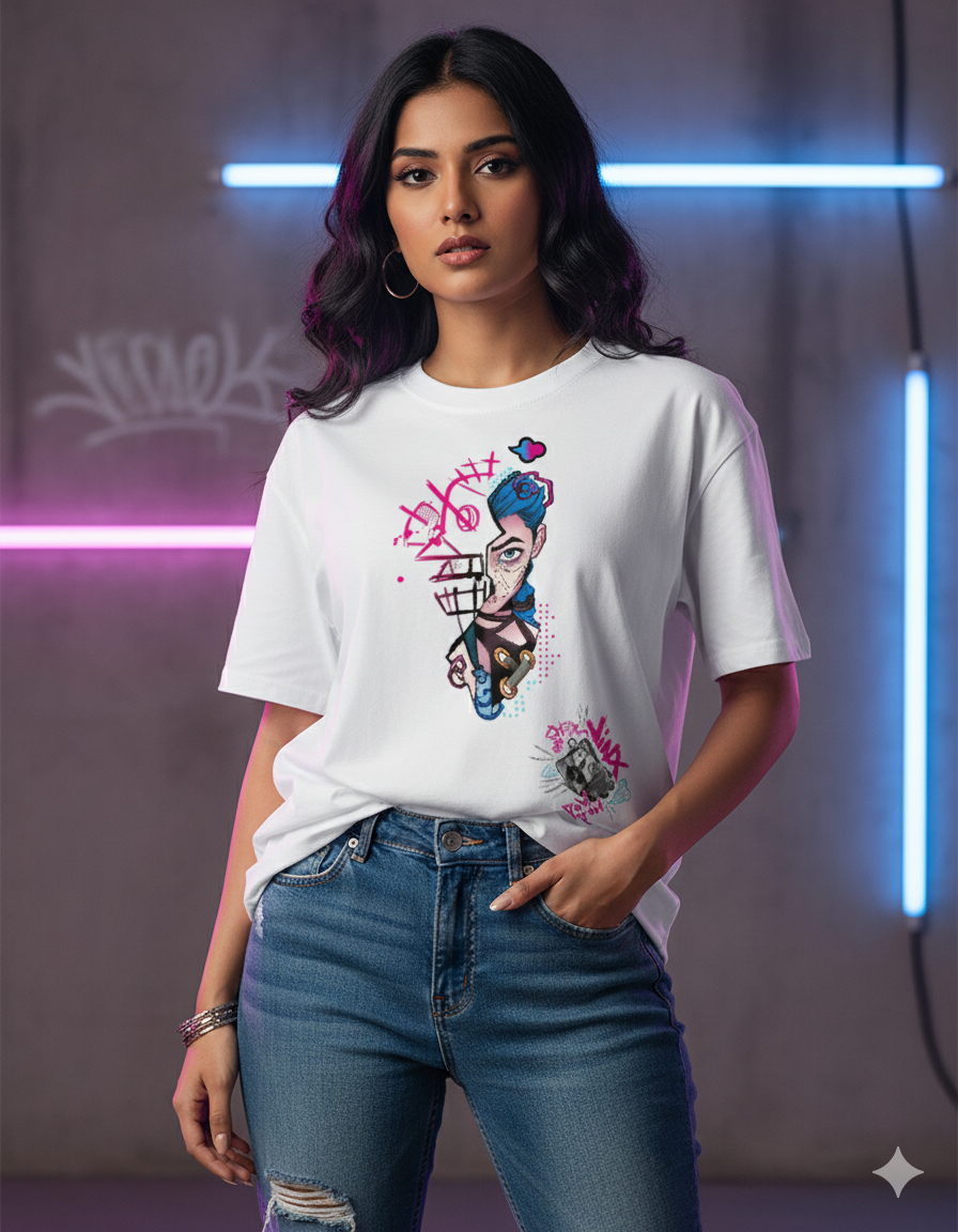 This tee is chaos on cotton — a canvas painted with Jinx’s madness.